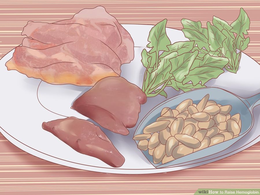 - Ешьте еду, которая богата железом. Железо-очень важный элемент для выработки гемоглобина. Ешьте больше печени, мяса, креветок, говядины, шпината, ананасов и орехов.