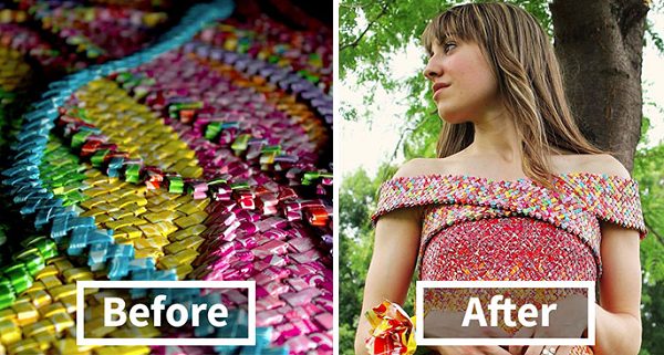 Я покупала конфеты Starburst и обертки, с помощью друзей и семьи в течение 4 лет, чтобы создать это платье. После того, как я насобирала нужное количество этих фантиков, я разложила их по цветам, прогладила, складывала в квадратики и делала цепочки.