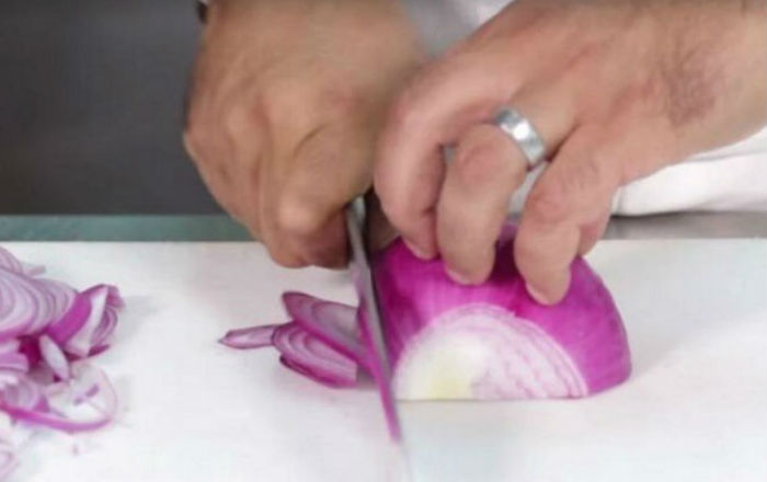 Разрежьте луковицу вдоль, затем разрежьте половинку на три части, прорезая овощ только на три четверти. Сделайте такие же разрезы на 3/4, не прорезая до конца, сверху луковицы. После этого мелко нарежьте её!