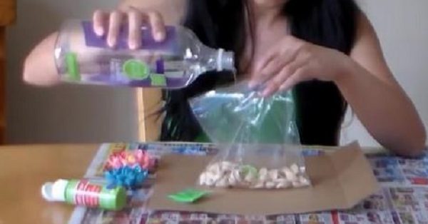 Поместите фисташковые раковины в хорошо запечатанный мешок — в этом случае лучше всего пакеты для морозильной камеры. Положите в сумку акриловую краску и столовую ложку воды.