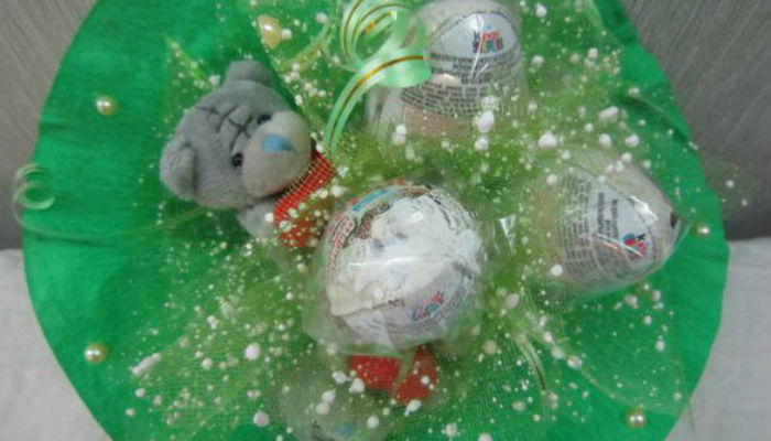По материалам: http://www.ujut-v-dome.ru/buket-iz-kinder-syurprizov-i-myagkix-igrushek/