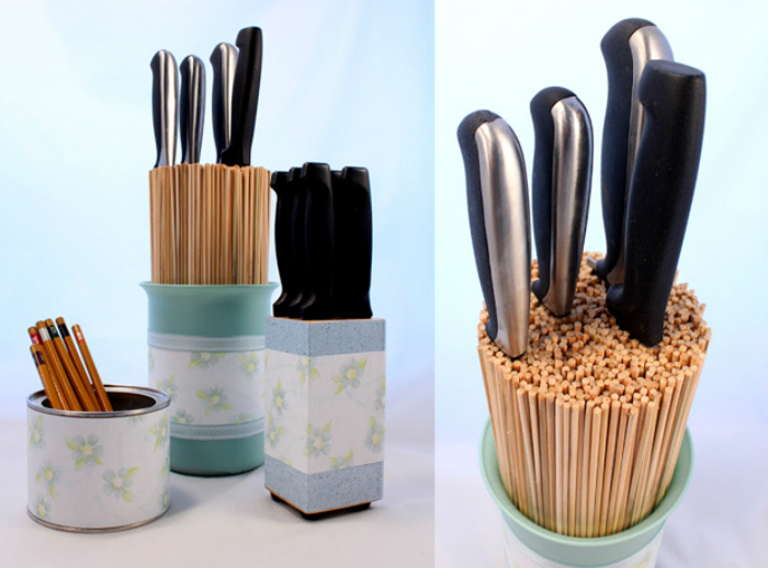 Многие привыкли хранить ножки в ящиках, рядом с ложками и вилками. Но при таком варианте хранения есть риск порезаться, когда вы будете доставать но или другие столовые приборы. Поэтому лучше использовать удобные подставки для ножей, которые можно приобрести в магазинах (зачастую вместе с набором ножей). Но если по каким-то причинам купить подставку нет возможности, вы можете соорудить на скорую руку альтернативу!