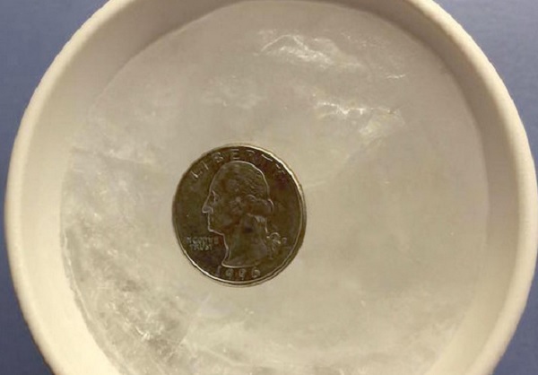 Налейте в чашку воды, поместите в морозильную камеру. Когда вода превратится в лед, положите монетку на поверхность льда и вновь поместите чашку в морозильник.