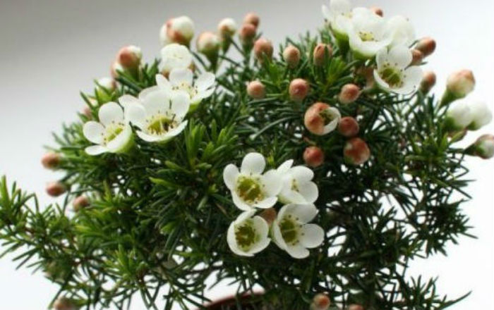 И это действительно чудо — благодаря тонким глянцевым листочкам кустик внешне очень похож на хвойное растение, но в момент продажи хамелациум весь буквально усыпан бутонами и цветками. Ошеломляющее впечатление — елка в яблоневых цветках!
