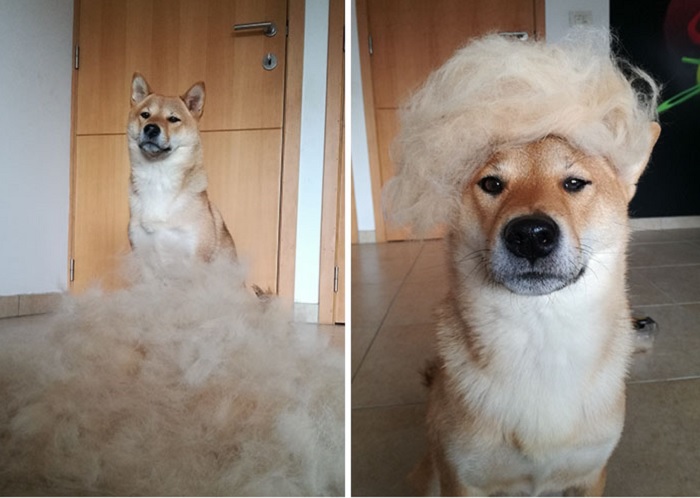 Известный своей толстой пышной шерстью, Шиба действительно требуют регулярного ухода. Владелец собаки решил использовать состриженную шерсть для изготовления смешных париков Вау.