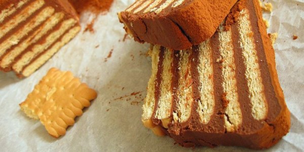 5. Выкладываем слоями в в форму: слой печенья, щедрый слой крема, снова печенье и крем… и т.п. пока не закончится крем. Верхний слой крем.
