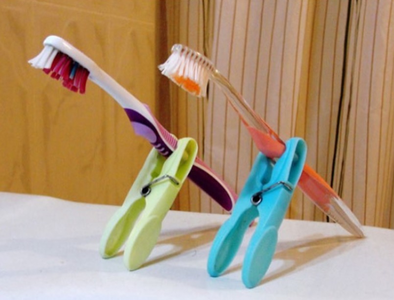 1. Чтобы не допустить попадания зубных щёток на пол, используйте прищепки, чтобы придерживать их в вертикальном положении.