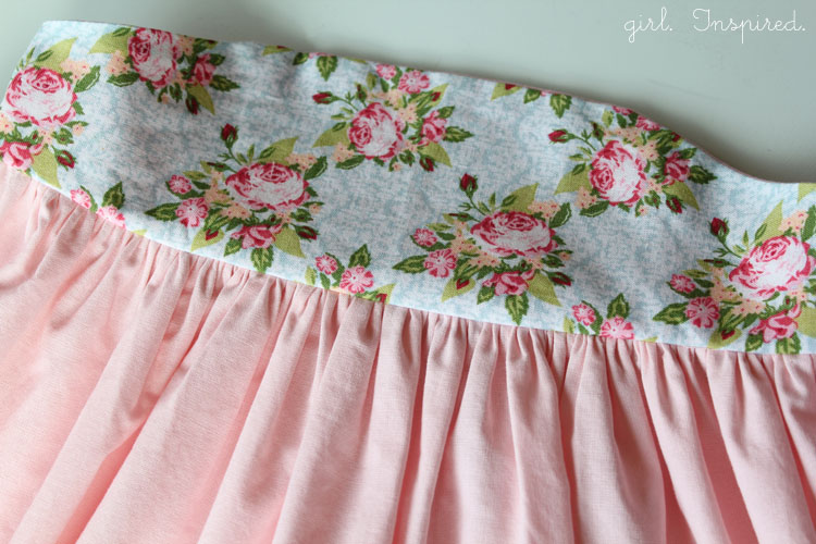 Если вы, как в нашем примере, шьете платье с присборенной юбкой, продолжайте вытягивать зубную нить до тех пор, пока ширина юбки не сравняется с шириной детали лифа.