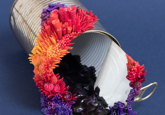 Французская художница использует полимерную глину для создания форм, полученных от найденных объектов. «Моя работа — это ода для жизни, где растения и грибы встречаются с насекомыми, животными и минералами», — пишет она на своем веб-сайте. «Эти кораллы растут в красочном вихре разнообразия на найденных объектах, в диалоге между человечеством и природой».