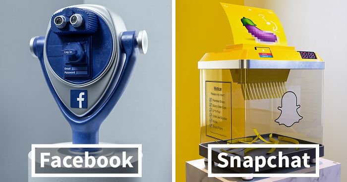 Этот американский художник решил превратить свое увлечение в искусство с кусочком иронии. Бен Фернли сделал проект под названием «Революция в социальных сетях» — это набор концептуальных 3D-иллюстраций, в которых используются визуальные метафоры, чтобы просто подводить социальные приложения и играть по тому способу, которым они используются. Прокрутите вниз, чтобы увидеть их сами.