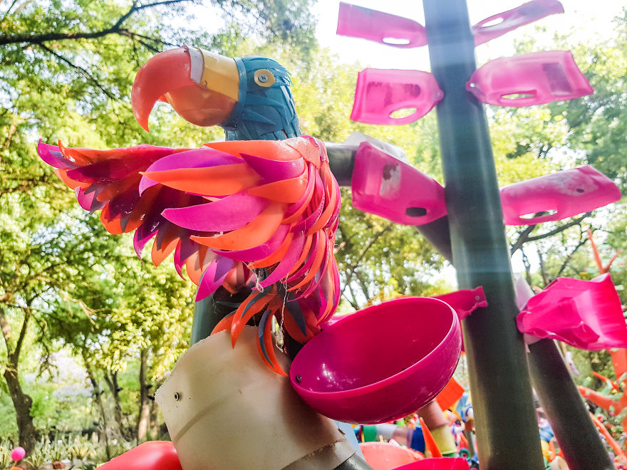 В Мехико эти Герои называются Пепенадоры и с помощью их детей, более 700 учеников, приюта для престарелых и более 100 добровольцев они превратили 3 тонны пластиковых отходов в цветной пластиковый лес площадью 500 м2, заполненный тысячами цветов, деревьев и животных.