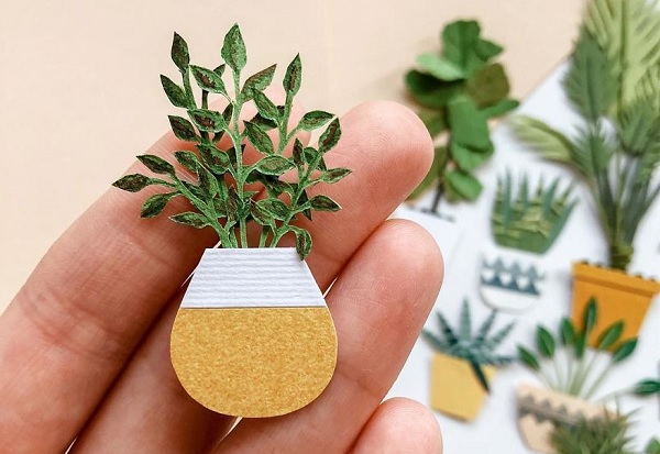 Используя микро-стиль техники резки бумаги, она может изготовить крошечные бумажные растения, которые использует для украшения поздравительных открыток и украшенных художественных произведений.