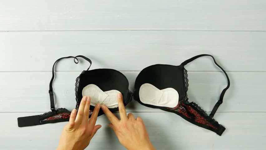 Снова на подмогу вам придут… прокладки. Все, что вам нужно сделать — разрезать прокладки пополам, а затем приклеить их под углом на нижнюю часть каждой чашки бюстгальтера.