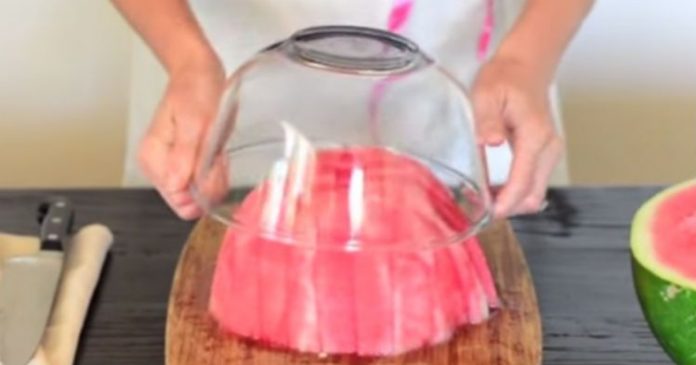 После того, как арбуз очищен от кожуры — разрезать его на длинные, простые кусочки. Переверните разделочную доску на 90 градусов и нарезайте снова в противоположном направлении. Возьмите большую миску, ту, которая соответствует арбузу и поместите её над ним. Переверните разделочную доску снова и вы получили себе миску с идеально нарезанными кусочками арбуза. Правда, круто вышло?