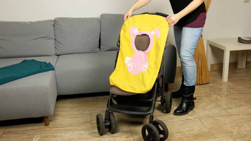 Теперь вы можете растянуть покрывало над коляской и закрепить его с помощью шнурка. Используйте молнию, чтобы сделать отверстие достаточно большим, и с легкостью посадить или достать вашего малыша.