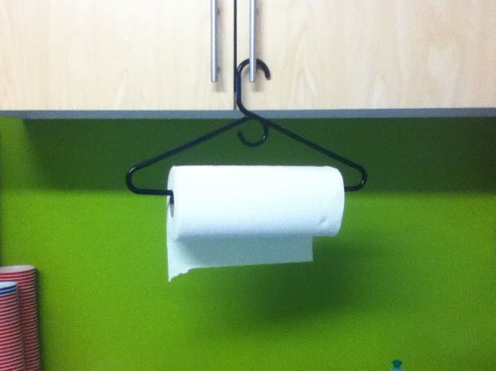 Если вы не знаете, куда положить бумажный рулон, вы можете повесить его на вешалку. Просто отрежьте нижний стержень на несколько дюймов от одного конца, чтобы вы могли вытащить его и надеть рулон. Задача решена!