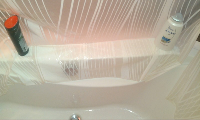 Если у вас небольшой душ или ванна, есть одно хорошее решение для сохранения занавески подальше от вашего мокрого тела. Просто зажмите занавеску для душа внизу по краю ванны, прежде чем класть бутылки шампуня поверх нее, чтобы удержать ее на месте. Это также работает с использованием магнитов.