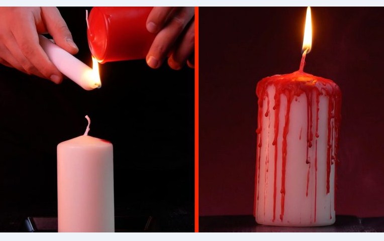 Для этого вам понадобится одна белая свеча и одна красная свеча. Подожгите красную свечу и держите ее над белой свечой, так чтобы красный воск капал на белую свечу и стекал по бокам, словно это кровь. Жутко!