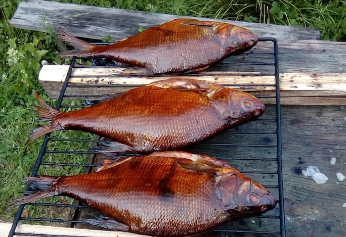 Упущу инженерные детали, и расскажу об общем принципе работы коптильни: на дно ящика укладывается слой влажных опилок, над ними устанавливаются решетки с продуктами: например, рыбой, или грудинкой. На ура у нас идут речные лещи и карпы, папа даже на продажу заказы делал (довольно выгодный бизнес, между прочим, особенно, если сырье будет куплено по оптовой цене напрямую от рыбаков). Коптилка ставится в специально отведенное место, там, где совсем недавно горел костер. Когда дрова почти прогорят, то ящик водружается над углями. Угли и небольшой огонь от дров нагревают железо – опилки начинают тлеть и выпускают ароматный дым. В это время крышка ящика закрывается, и остается только ждать. Сколько по времени будет идти процесс копчения, зависит от того, что вы хотите закоптить – мясо готовится дольше, курица и рыба – быстрее. Аромат умопомрачительный, как, впрочем, и получившиеся копчености.