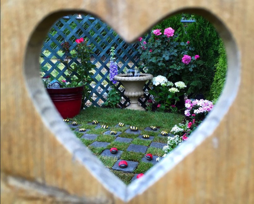 Она не забыла использовать подходящие для ребенка камни в качестве игровых предметов. В этом саду они состояли из расписных камней — роя пчел и отряда божьих коровок.