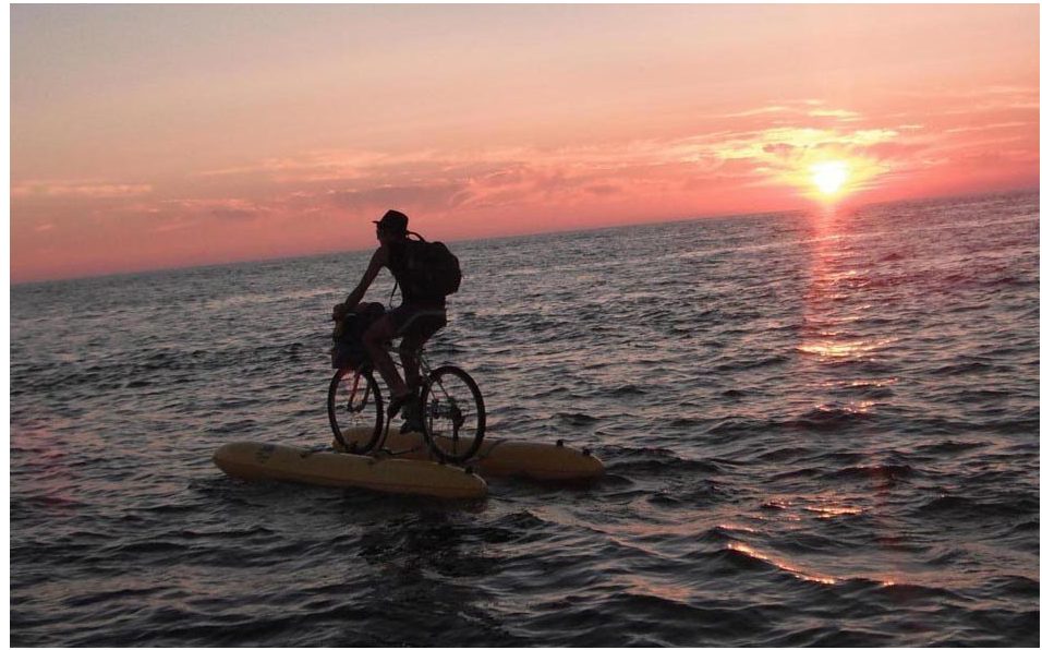 Набор, который позволяет велосипеду стать лодкой, состоит из поплавков, которые являются надувными и воздухонепроницаемыми, с особым видом педалей для велосипеда, которые подталкивают воздух к поплавкам.