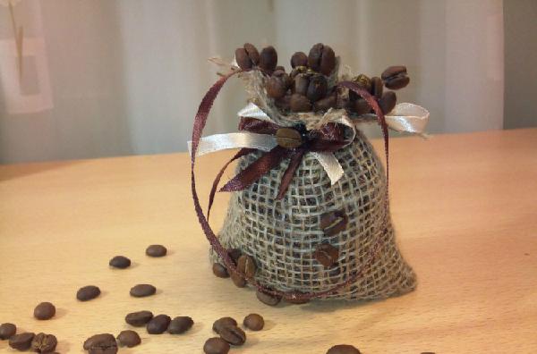 Лучше всего использовать для изготовления такого кофейного ароматизатора обыкновенную мешковину. Смотрится она очень привлекательно и довольно необычно. Кусочек такой мешковины нужен совсем небольшой – где-то 15х15 сантиметров. Можно размер и подкорректировать по Вашему усмотрению, но такая величина всё-таки наиболее оптимальна. Далее Вам нужно будет из этого кусочка мешковины сделать мешочек. Можно сделать это руками, а можно прострочить его быстренько на машинке. После изготовления такого мешочка, его следует вывернуть и после этого хорошенечко прогладить. Так Вы ему придадите вполне устойчивую форму. Для украшения такого мешочка на нём можно написать «импортными буквами» слово «Coffee». Эту надпись можно также приклеить или вышить. Плюс к надписи, с помощью клеевого пистолета, добавьте на мешочек ещё и несколько кофейных зёрен. Конечно, если страсти к декору у Вас нет, то можно всё это и не делать.