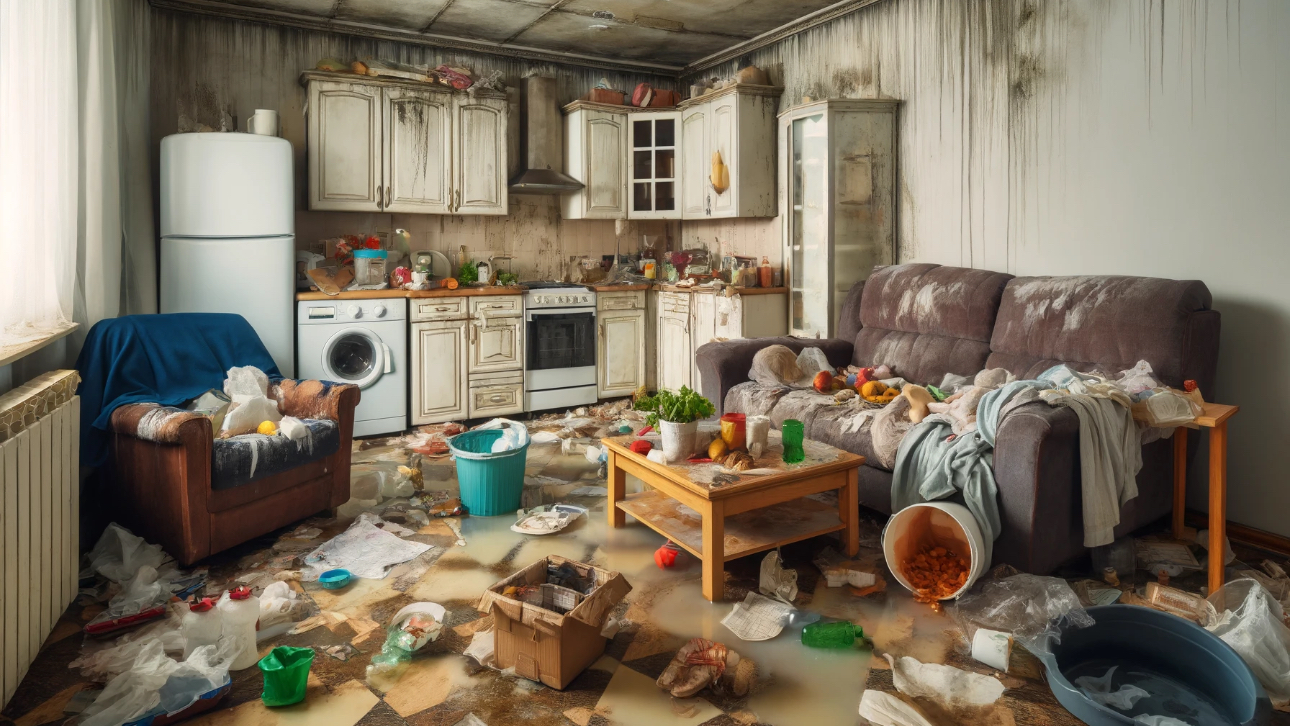 На кухне царил беспорядок: грязная посуда в раковине, липкий пол и заплесневелые остатки еды на столе.