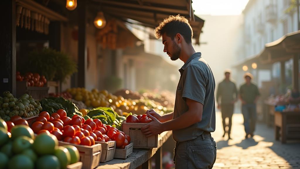 Андрей, молодой продавец овощей на рынке, каждое утро начинал свой день одинаково. Как только начинало светать, он уже был на месте: аккуратно раскладывал ящики с овощами, фруктами и зеленью на своём небольшом лотке. Работа была совсем не из лёгких. Утром — вставай раньше всех, потом таскай эти тяжёлые ящики, в конце дня убирай за собой всё обратно. Но Андрей привык. Он находил в этом своё особое удовлетворение, даже если временами было трудно. Есть в таком труде нечто особенное, что даёт чувство завершённости: видишь, как твоя работа превращается в порядок. Всё лежит ровно, красиво, каждое яблоко — как картинка, вся зелень — словно специально для фото. А покупатели, хотя и разные, оживляли каждый день по-своему.