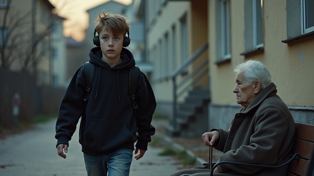 В тот день что-то внутри изменилось. Он не побежал к подъезду, как обычно, а замедлил шаги. В наушниках гремела музыка, но он ничего не слышал — взгляд невольно тянулся к бабушке. Её лицо, уставшее, но доброе, смотрело куда-то вдаль, а руки аккуратно лежали на трости. Максим снял наушники и нерешительно подошёл ближе.