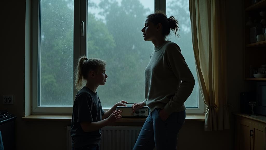 Он берет Дарину на руки, чтобы она смогла увидеть огромные лужи во дворе, упавшую березу и залежи веток, листьев и прочего мусора между окнами – видимо, внешняя форточка была открыта.
