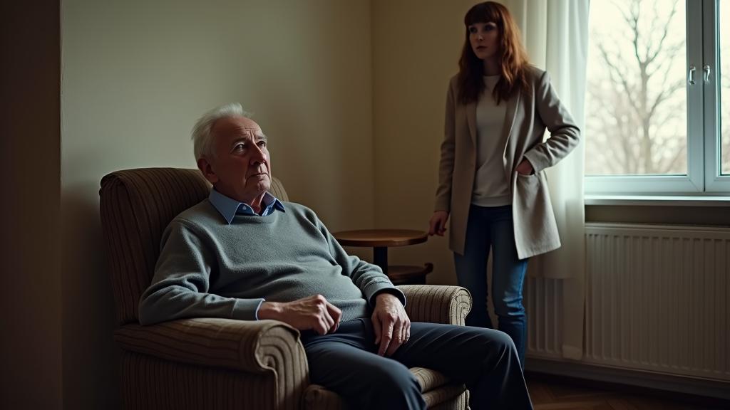Дочь подходит, гладит его по щеке.