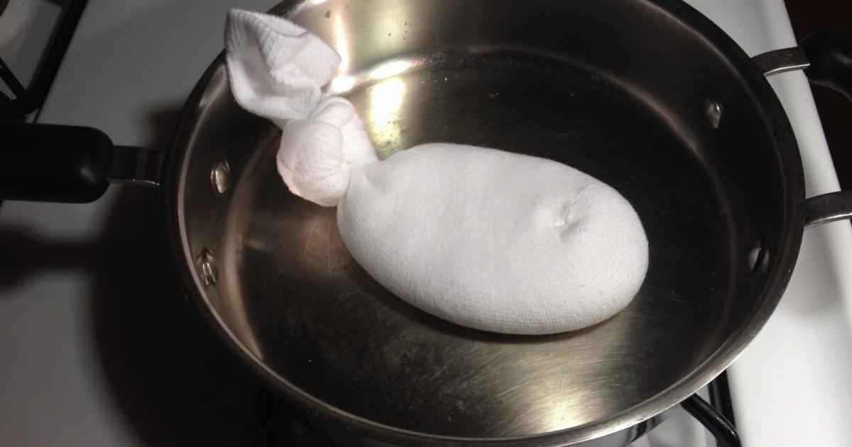 Затем поместите всю эту вещь в кастрюлю на средний огонь. 4-6 минут в общей сложности должно быть достаточно. Лучше всего, когда носок регулярно поворачивается. В качестве альтернативы, вы можете нагреть носок в микроволновой печи. Это, однако, проблематично, так как соль не становится равномерно нагретой, и трудно судить о том, насколько долго носки должны оставаться в микроволновой печи. Во-вторых, ткань носка имеет возможность разорваться . Таким образом, вы должны поместить носок в микроволновую печь, но с пятисекундными интервалами, которые отнимают много времени. Метод в кастрюле гораздо лучше.