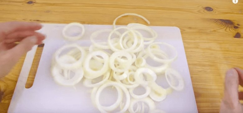ЛУКОВЫЕ КОЛЬЦА — срезать верхнюю и нижнюю часть лука, очистить от шелухи. Поверните лук на бок, вставьте гребень в центр. Используйте для резки пространство между зубьями для ровных колец. Высуньте гребень и отделите кольца друг от друга.