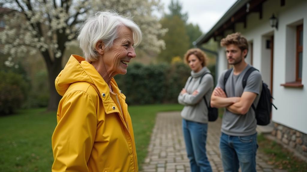 Из дома вышла сияющая свекровь в своем жёлтом плаще.