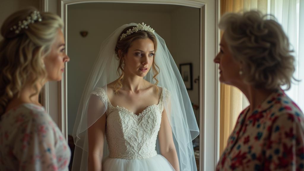 Клавдия, тётя моего жениха, суетилась вокруг меня, поправляя складки и что-то бормоча себе под нос. Внезапно дверь приоткрылась, и в комнату заглянул Лёня.