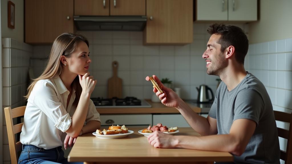 Студенческое общежитие гудело. Конец месяца, стипендия ещё не пришла, а старые запасы подходили к концу. Марина сидела на общей кухне, задумчиво глядя на последний кусок колбасы. Взгляд её остановился на парне, который устроился рядом.