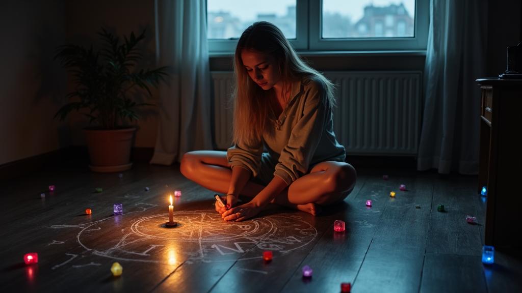 Она уверенно вывела большой круг на полу. Закончив, уселась прямо в его центре и принялась чертить внутри какие-то странные символы.
