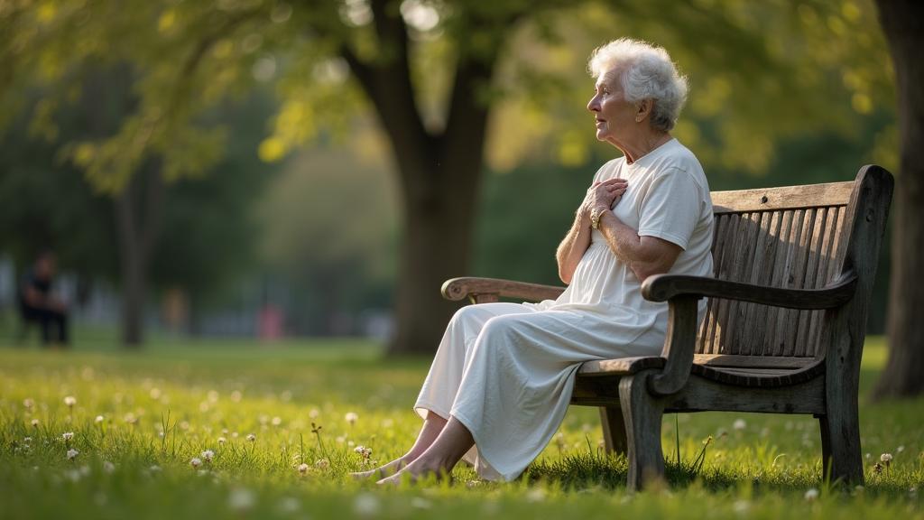 Прохожу пару метров и вижу женщину лет шестидесяти, сидящую на скамейке. Глаза закрыты, тяжело дышит, держится за грудь.