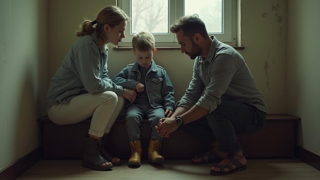 В небольшой раздевалке при доме ребёнка на низкой скамейке расположился мальчик примерно четырёх лет. Рядом суетились двое взрослых — молодая женщина и более взрослый Сергей. Они быстро снимали с ребёнка мокрые ботинки, комбинезон и шапочку. Женщина ловко застегнула на нём небольшую джинсовку, а Сергей, неуклюже запутывая ноги, пытался надеть сандалии.