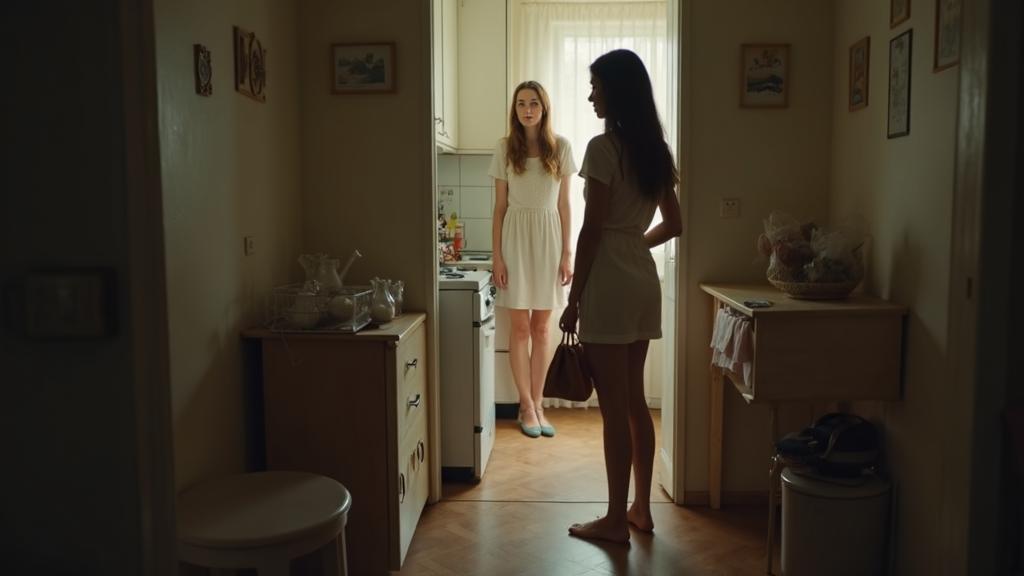 Кварти́рная дверь семьи Ковалёвых едва приоткрылось, и в проёме появилась стройная молодая женщина с загорелым лицом и аккуратной сумочкой, свешивающейся с плеча.