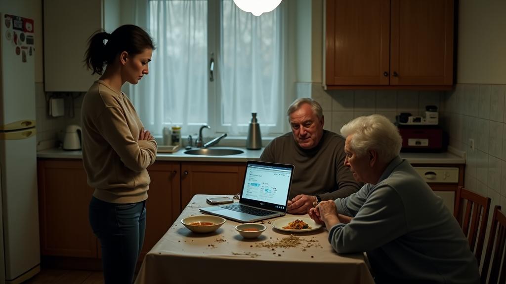 Кухня гудела от звуков ссоры. Даже потолочная лампа мелькала, словно вступая в конфликт своим мерцанием. На столе лежал недоеденный суп, рядом распахнут ноутбук, показывающий страницу банка. Елена стояла у окна, сложив руки на груди, и её лицо горело от гнева.