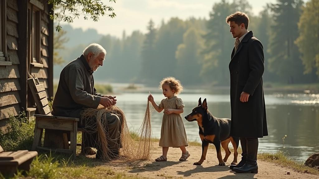Старик Евсеев сидит, сети распутывает, рядом девочка с тёмными глазами вертится, ручки у неё гибкие, пальчики тонкие, сама по себе невероятной красоты, настоящее чудо, а не ребёнок.