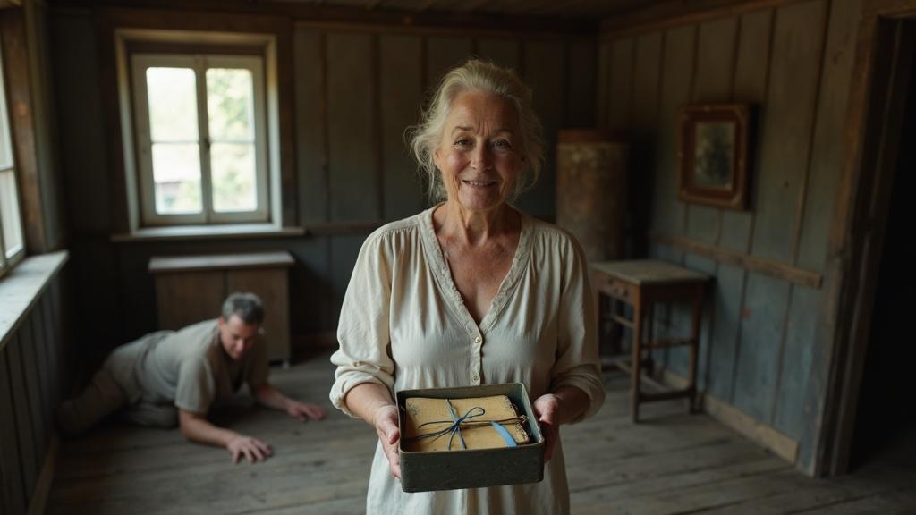 Таня, посмотри, что я обнаружил! — Олег выполз из-под половиц, весь покрытый пылью, держа в руках жестяную коробку из-под печенья. — Здесь какой-то тайник!