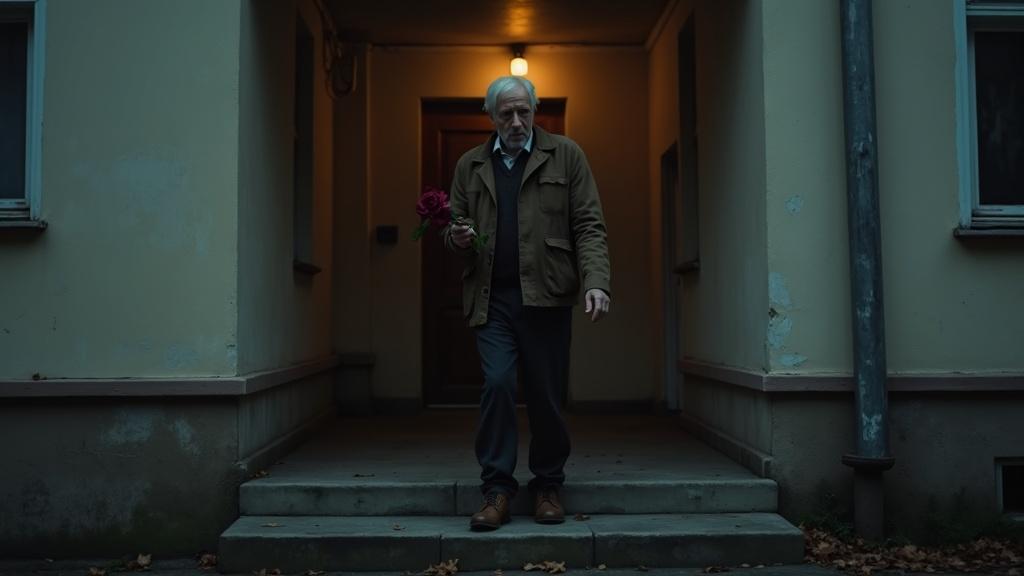 Дмитрий остановился у подъезда, сжимая в ладони тёмно-бордовый бутон. Цветок слегка качнулся, когда сквозняк из приоткрытой двери коснулся его лепестков.