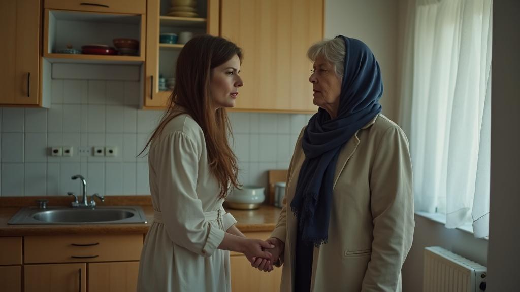Гостья вошла в квартиру, внимательно осмотрев прихожую. На ней был светлый плащ и тёмно-синий платок, завязанный под подбородком по старинке.