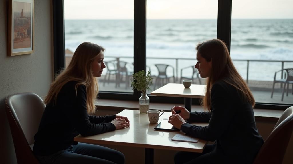 За стеклом бушевал ноябрьский ветер, гнавший волны к берегу, а пустые шезлонги покачивались на цепях, скрипя под порывами.