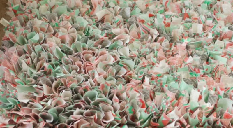 Затем соберите ткань ремнем. Они в конечном счете станут волокнами вашего нового ковра. Ткань не должна быть слишком тонкой. Старые кухонные полотенца (чем тоньше вид) работают очень хорошо. Конечно, вы также можете купить ткань специально для этого проекта.