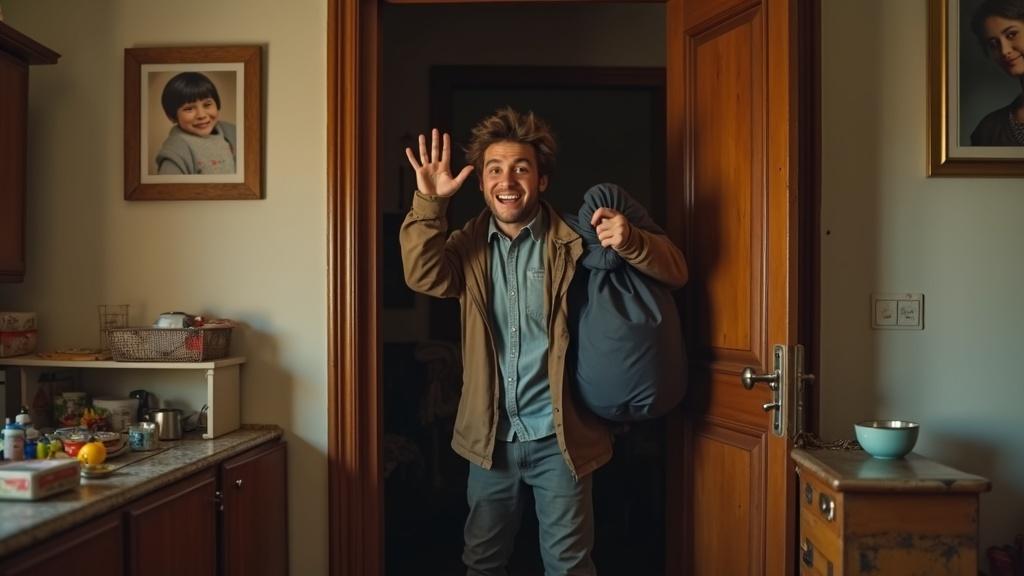 Лариса застыла в дверях, с удивлением глядя на племянника. Он стоял на пороге с двумя огромными сумками, из которых торчали учебники и свернутое одеяло. На лице сияла широкая улыбка, волосы взъерошены, куртка распахнута — типичный студент, уверенный в своей привлекательности.