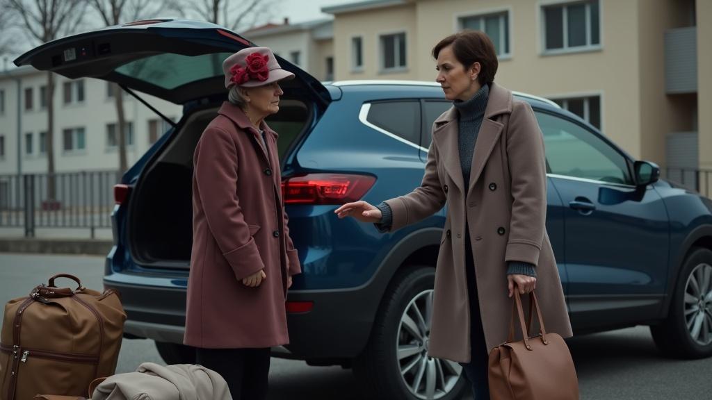 Лариса стояла у задней части новенького тёмно-синего кроссовера, опираясь локтем на крышку багажника с видом полноправной хозяйки. На ней было пальто неясного оттенка — что-то между «пыльной розой» и «увядшей свеклой», а на голове — шляпка с фетровым цветком, нависавшим над левым глазом почти угрожающе. Рядом на асфальте громоздились три клетчатые сумки, набитые чем-то тяжёлым и угловатым.