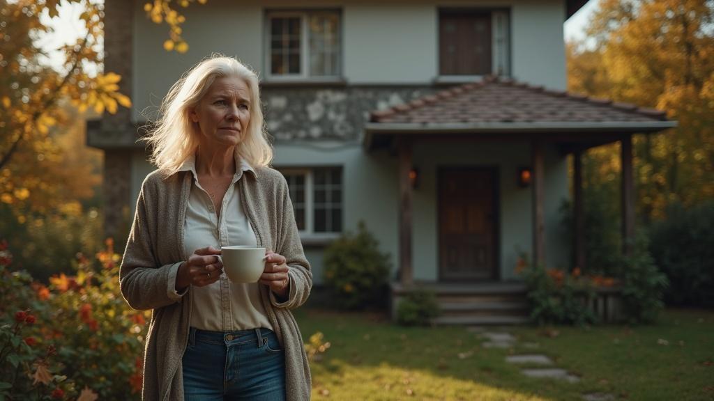 Октябрьский ветер срывал последние листья с яблонь, когда Оксана, держа в руках чашку горячего кофе, вышла на крыльцо. Дом, доставшийся ей от Марфы, стоял на краю посёлка — двухэтажный, с мансардой и уютной верандой, утопающий в зелени сада. В каждом уголке чувствовалось присутствие человека, который когда-то с любовью высаживал деревья, красил забор и собирал родных за большим столом. Оксана перебралась сюда пять лет назад после смерти тёти — та оставила ей дом по завещанию.